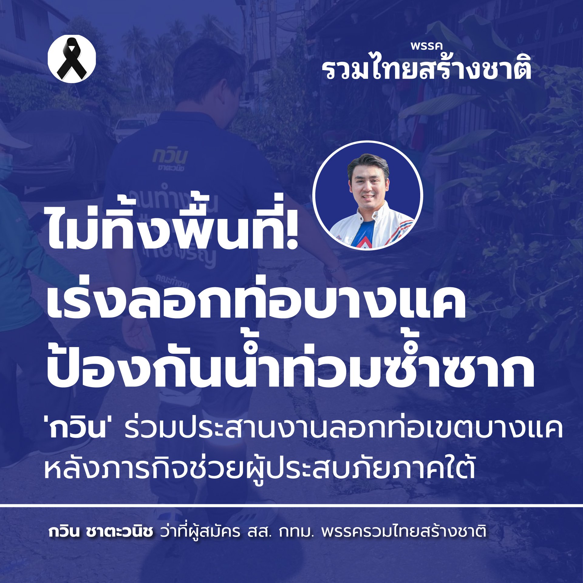 วันที่ 29 พฤศจิกายน 2568 นายกวิน ชาตะวนิช ว่าที่ผู้สมัคร สส. กรุงเทพมหานคร พรรครวมไทยสร้างชาติ เปิดเผยถึงการลงพื้นที่แก้ไขปัญหาในเขตบางแค โดยระบุว่า ภายหลังจากที่ได้เดินทางกลับจากการช่วยเหลือผู้ประสบภัยน้ำท่วมที่อำเภอหาดใหญ่ ได้ลงพื้นที่และดำเนินการประสานงานการลอกท่อระบายน้ำในพื้นที่หมู่บ้านชัยมงคล ซอย 6 และ 7 เพื่อป้องกันปัญหาน้ำท่วมและช่วยบรรเทาความเดือดร้อนของพี่น้องประชาชนในเขตบางแค กรุงเทพมหานคร