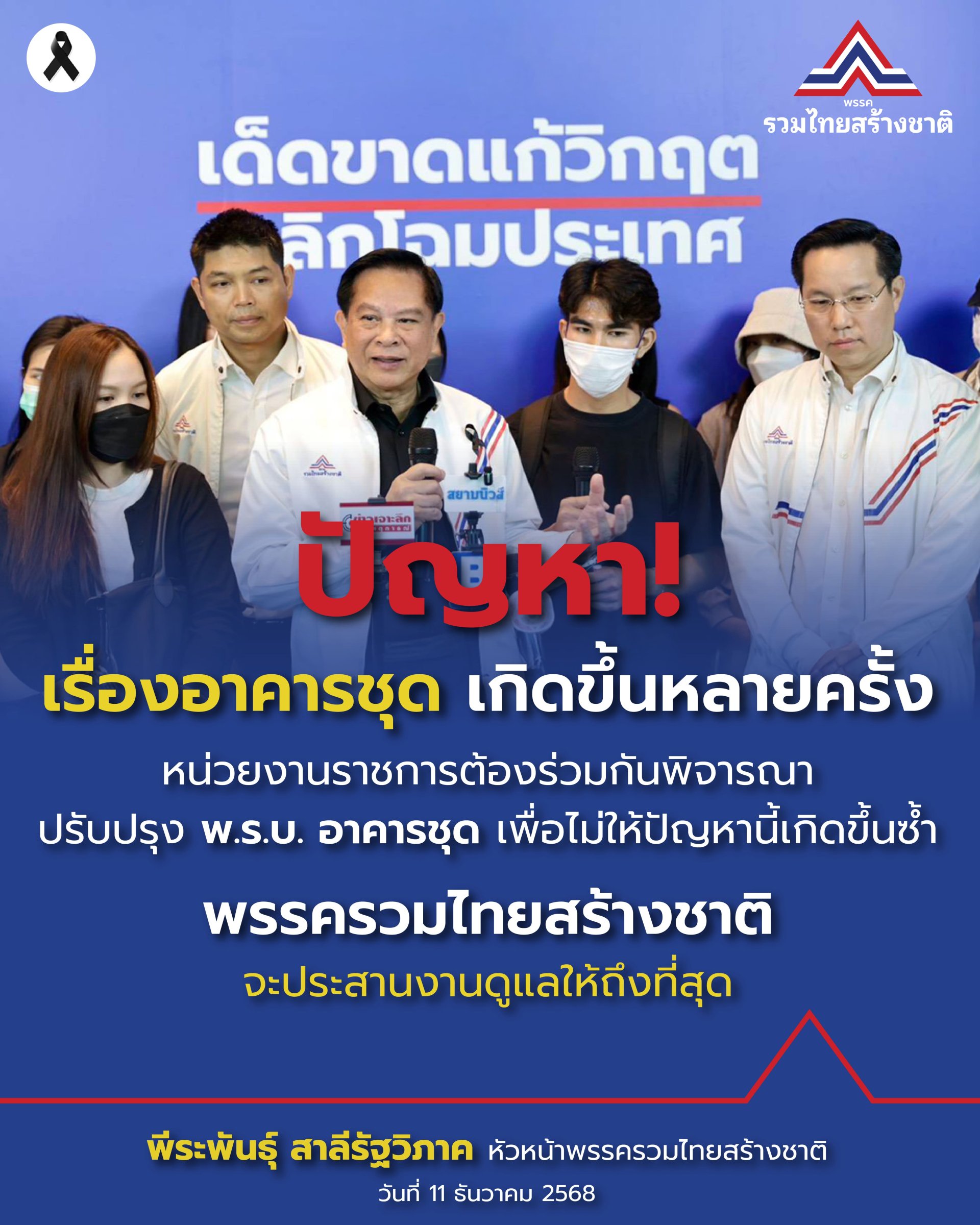 “ปัญหาเรื่องอาคารชุด เกิดขึ้นหลายครั้ง หน่วยงานราชการต้องร่วมกันพิจารณาปรับปรุง พ.ร.บ. อาคารชุด เพื่อไม่ให้ปัญหานี้เกิดขึ้นซ้ำ พรรครวมไทยสร้างชาติ จะประสานงานดูแลให้ถึงที่สุด”