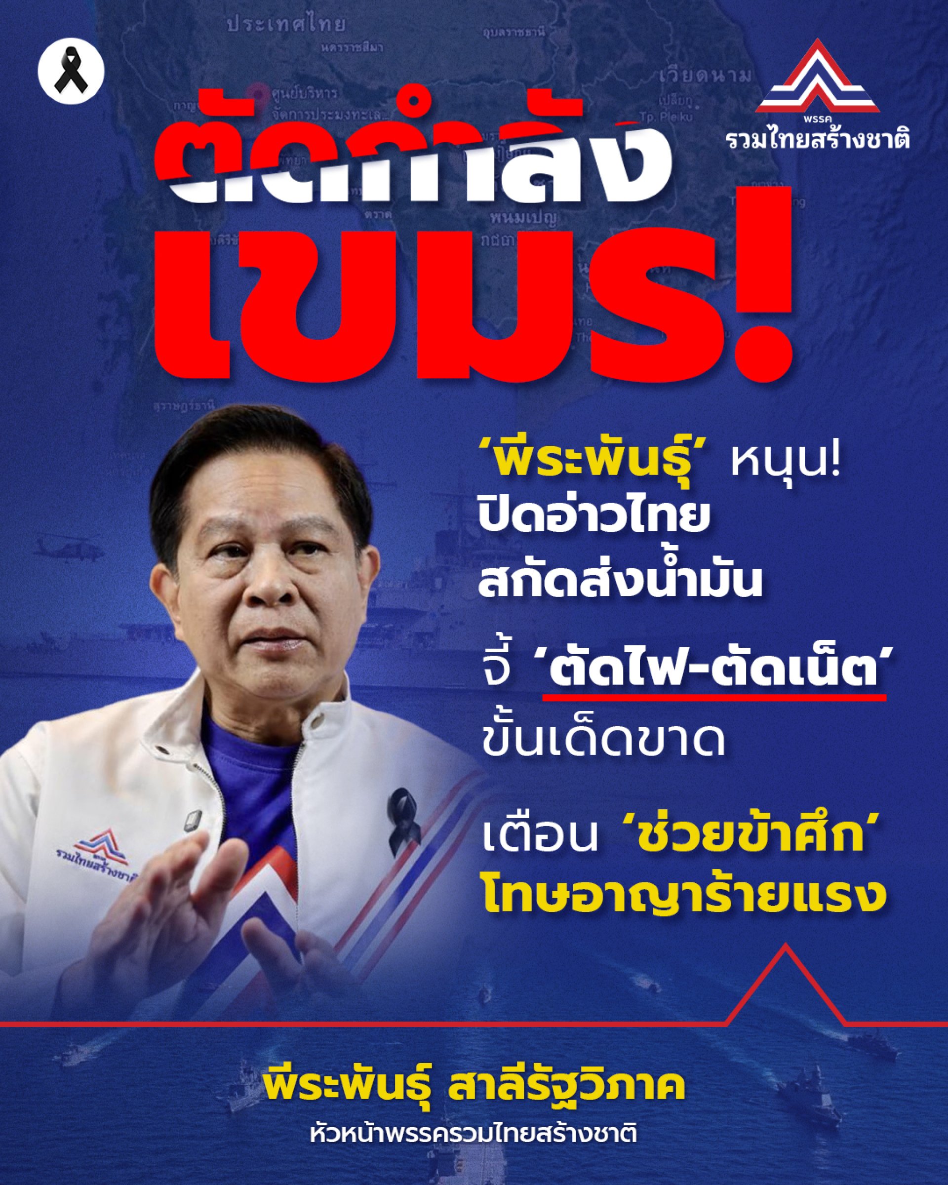 วันที่ 15 ธันวาคม 2568 นายพีระพันธุ์ สาลีรัฐวิภาค หัวหน้าพรรครวมไทยสร้างชาติ และอดีตรัฐมนตรีว่าการกระทรวงพลังงาน ได้แสดงความเห็นต่อสถานการณ์การสู้รบตามแนวชายแดนไทย-กัมพูชา โดยสนับสนุนให้รัฐบาลใช้มาตรการ "ตัดช่องทางลำเลียงยุทธปัจจัย" เข้าสู่กัมพูชาอย่างเด็ดขาด