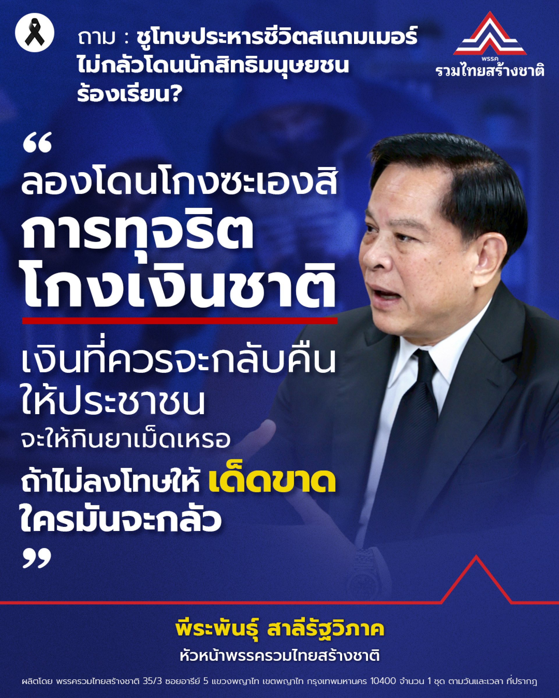 นายพีระพันธุ์ สาลีรัฐวิภาค หัวหน้าพรรครวมไทยสร้างชาติ และ แคนดิเดตนายกรัฐมนตรี อันดับ 1 ตอบคำถามในรายการ Dailynews Talk ถึงการชูนโยบายเรืองธงในการ ‘ประหารชีวิต’ สแกมเมอร์และคนทุจริตคอร์รัปชัน อาจมีความเสี่ยงโดนนักสิทธิมนุษยชนร้องเรียน โดยระบุด้วยความหนักแน่นว่า ต้องลองให้โดนเอง พร้อมย้ำว่าการแก้ปัญหาสแกมเมอร์ และคนทุจริตคอร์รัปชันต้องใช้ยาแรงด้วยโทษประหารชีวิต ลูกหลานชดใช้เงิน เพื่อปกป้องผลประโยชน์ของชาติ