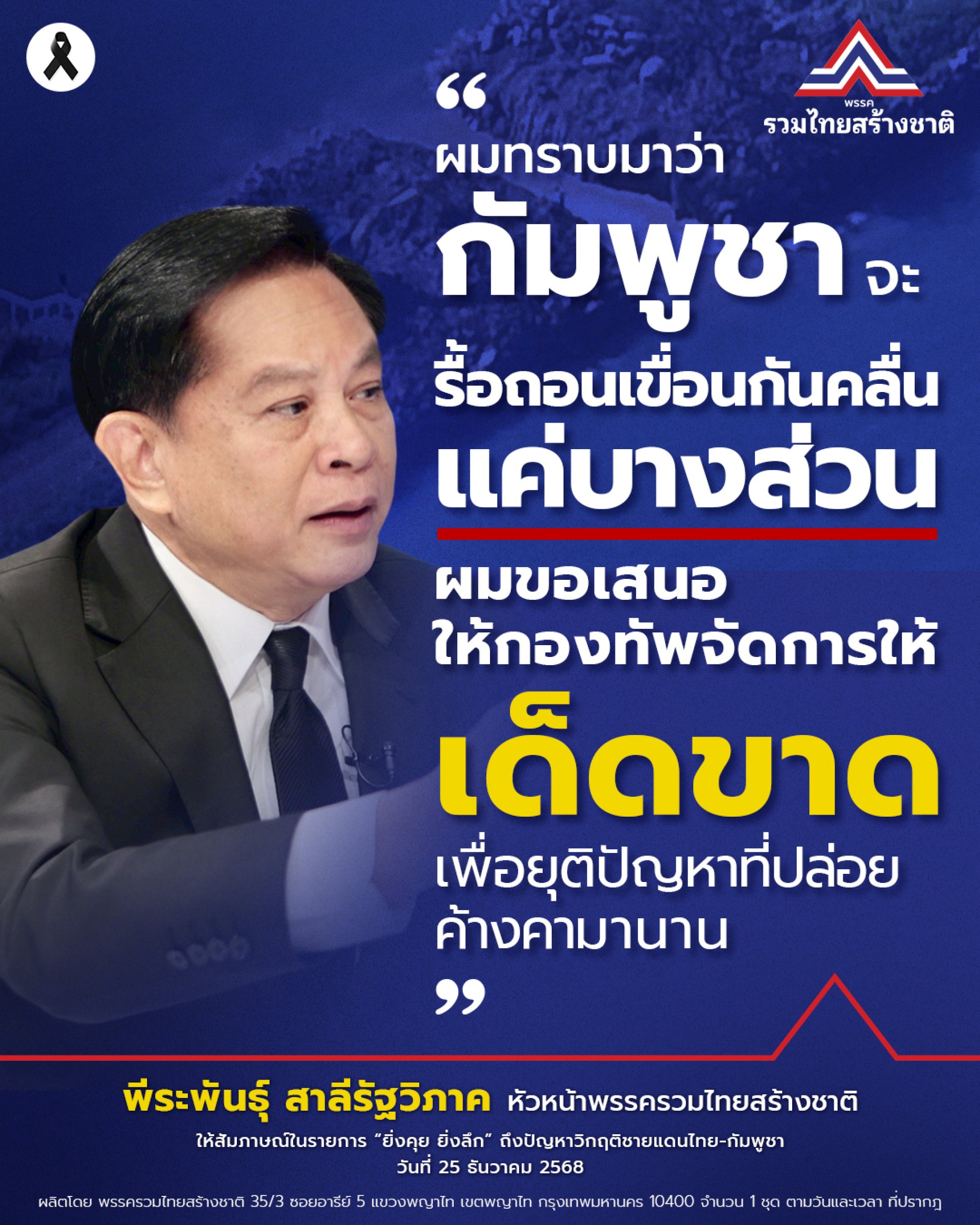 ‘พีระพันธุ์ สาลีรัฐวิภาค’ หัวหน้าพรรครวมไทยสร้างชาติ ให้สัมภาษณ์ในรายการ "ยิ่งคุย ยิ่งลึก" ถึงปัญหาวิกฤติชายแดนไทย-กัมพูชา ในวันที่ 25 ธันวาคม 2568